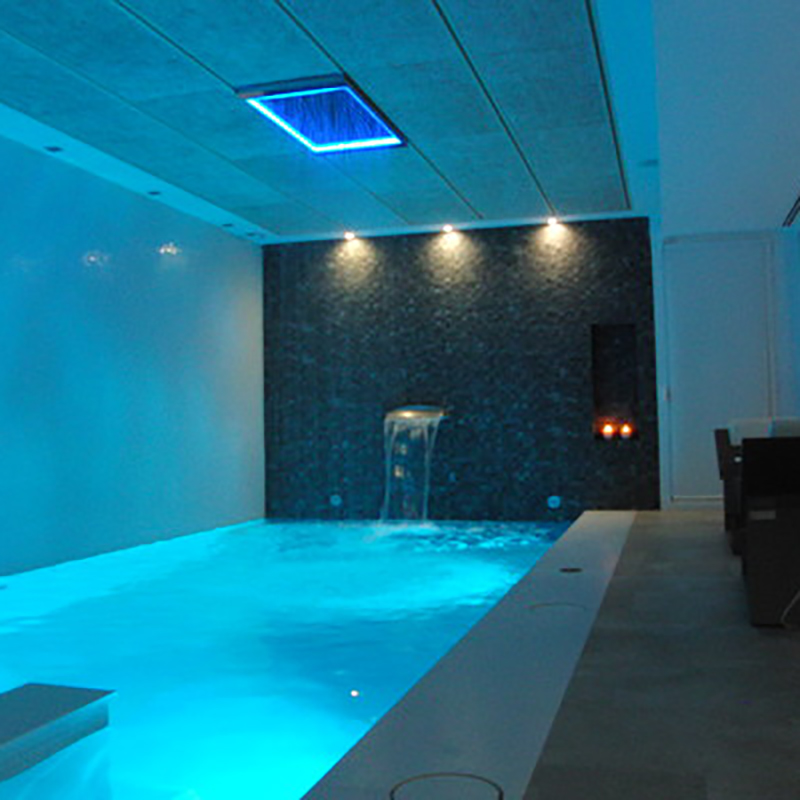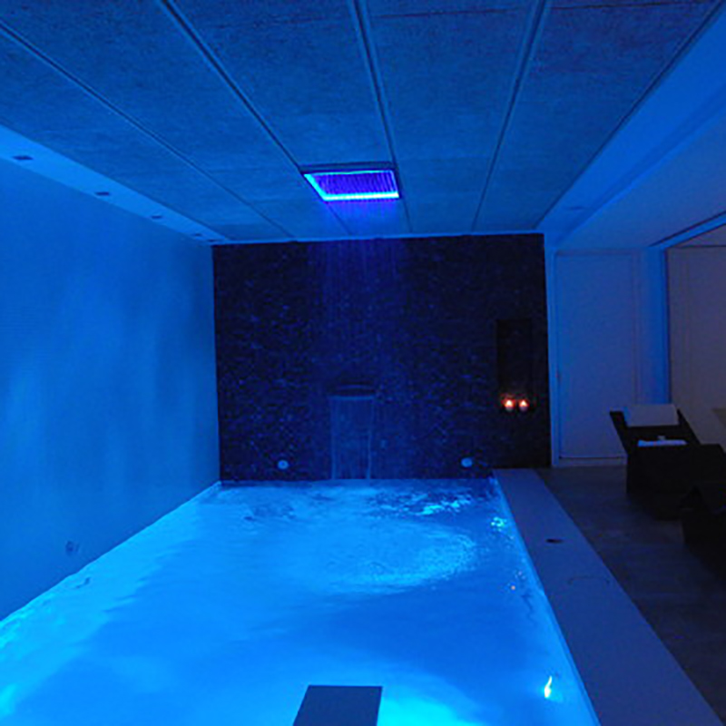 •1 piscina dinámica con cascada cervical, geiser, masaje lateral lumbar, bancos de hidromasaje mixto y ducha efecto lluvia de grandes dimensiones con cromoterapia en la parte superior del vaso.