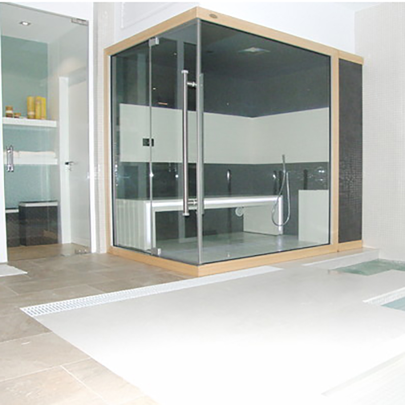 •Baño de Vapor con ducha de hidromasaje interior con frontal de vidrio, integrado en el ambiente.