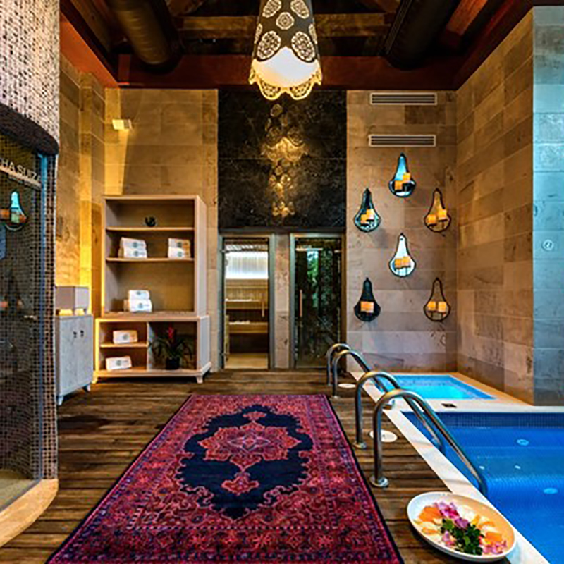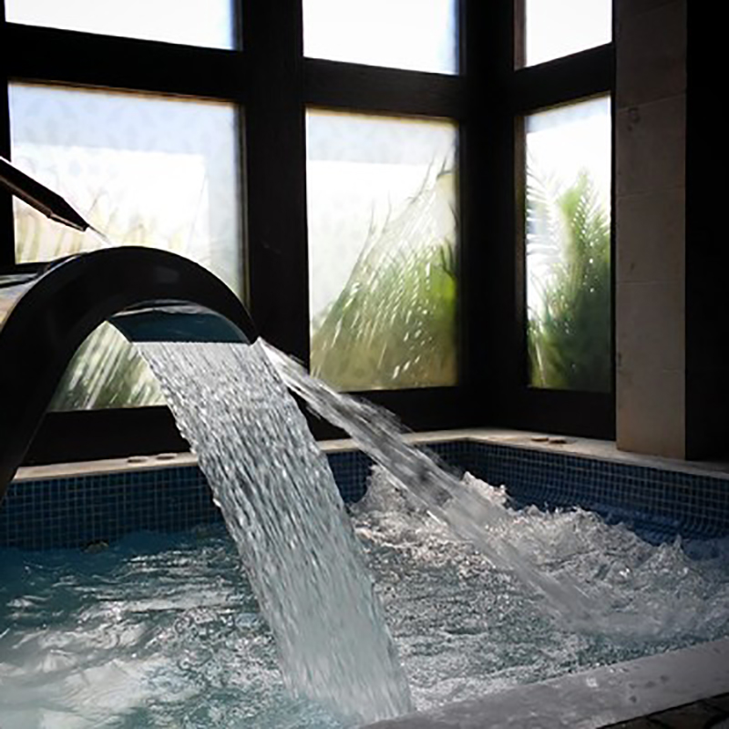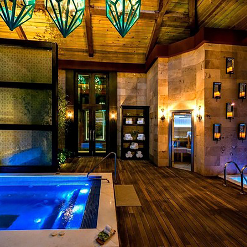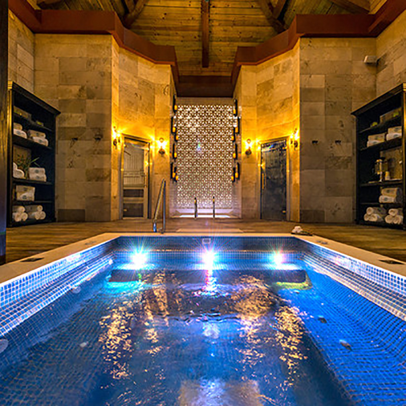 - SPA CON 2 ZONAS (HOMBRES Y MUJERES) COMPUESTAS DE 4 ALBERCAS CADA UNA, 1 ALBERCA DE JUEGOS ORNEMENTALES, 1 ALBERCA JACUZZI Y 2 ALBERCAS DE AGUA HELADA PARA CONTRASTE.