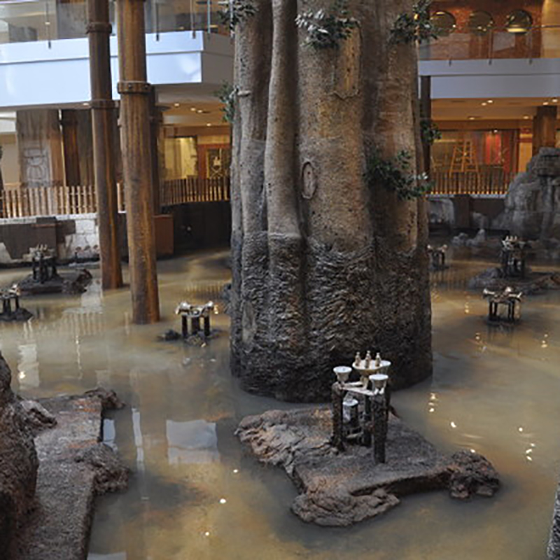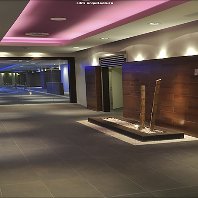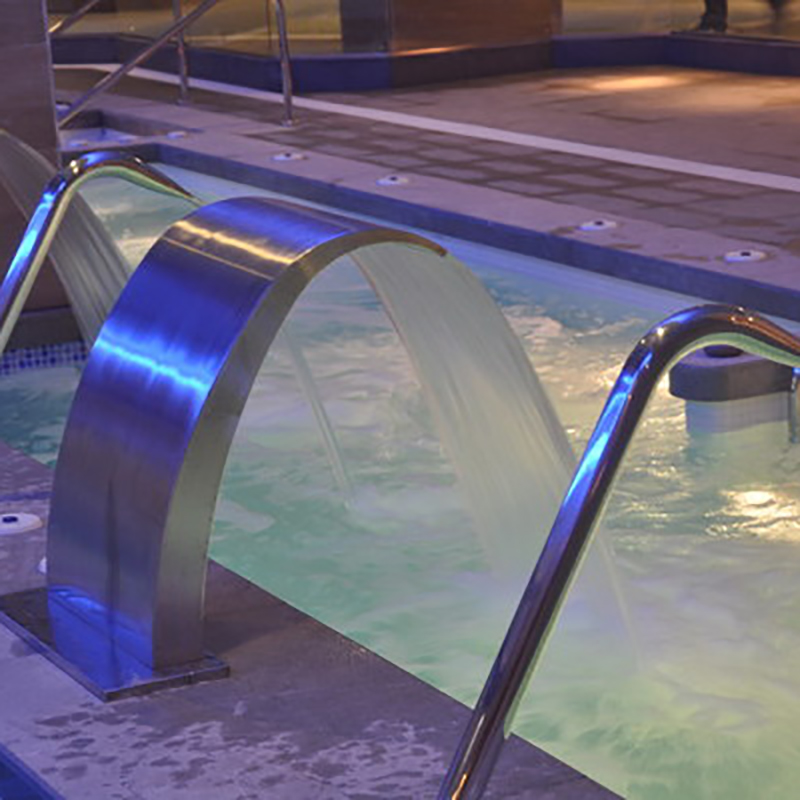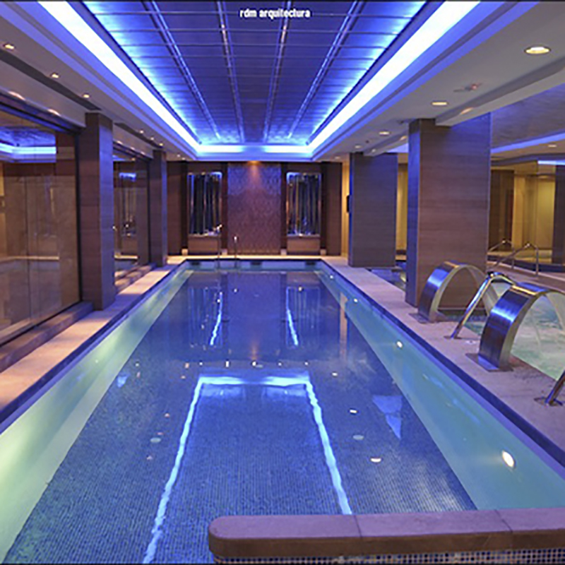 - La zona de aguas consta de 4 vasos de 180m2 de lámina de agua, piscina dinámica, con cascadas cervicales, cuello de cisne, bancos de hidromasaje, camas de masaje, grilla masaje de fondo, masaje laterales lumbares y dorsales.